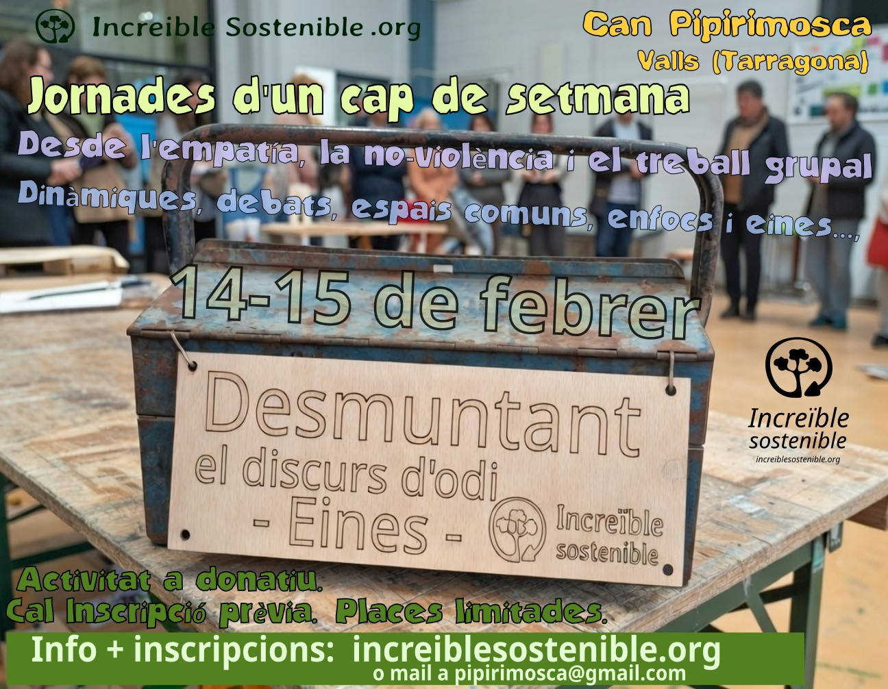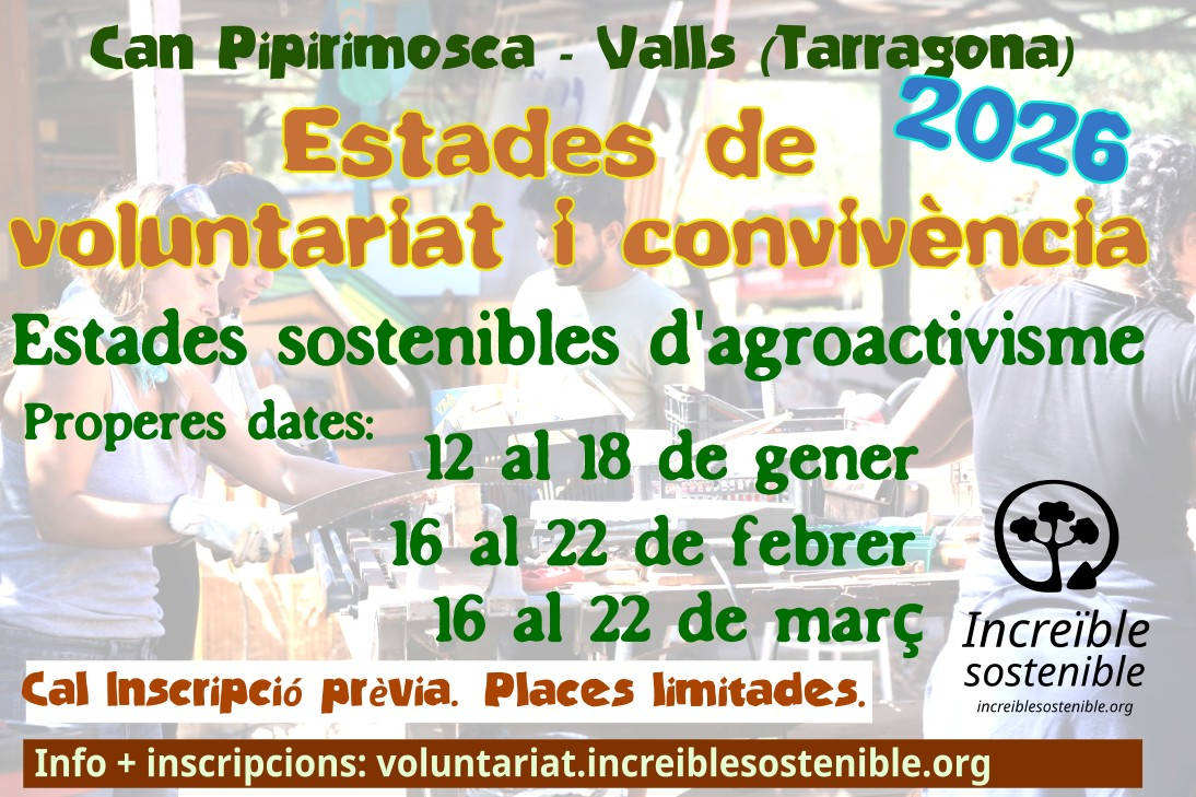 Del 12 al 18 de gener, obrim portes en la setmana de voluntariat i convivència, on us convidem a participar del projecte d'activisme ambiental de can Pipirimosca desde dins, vivint i practicant el decreixement, un estil de vida de baix impacte ambiental i un activisme enfocat a cuidar el planeta, aportar i posar les cures al centre.