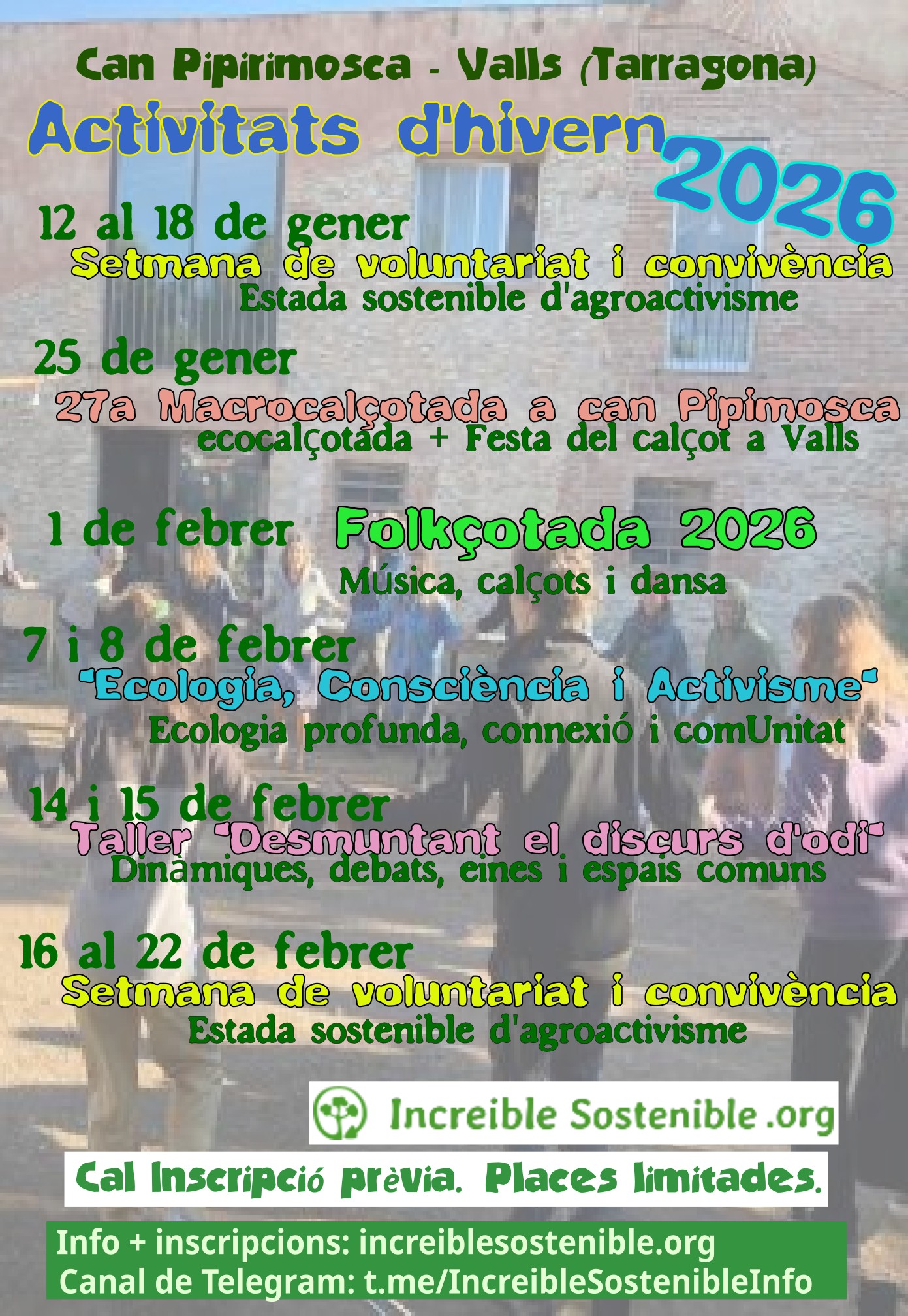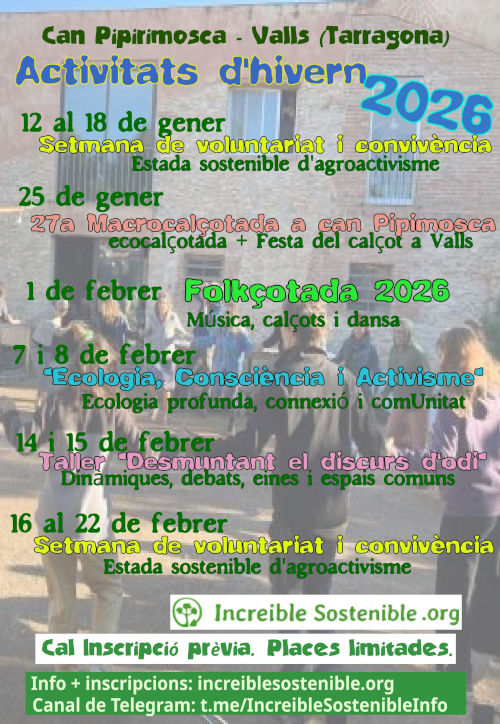 Del 12 al 18 de gener, obrim portes en la setmana de voluntariat i convivència, on us convidem a participar del projecte d'activisme ambiental de can Pipirimosca desde dins, vivint i practicant el decreixement, un estil de vida de baix impacte ambiental i un activisme enfocat a cuidar el planeta, aportar i posar les cures al centre.