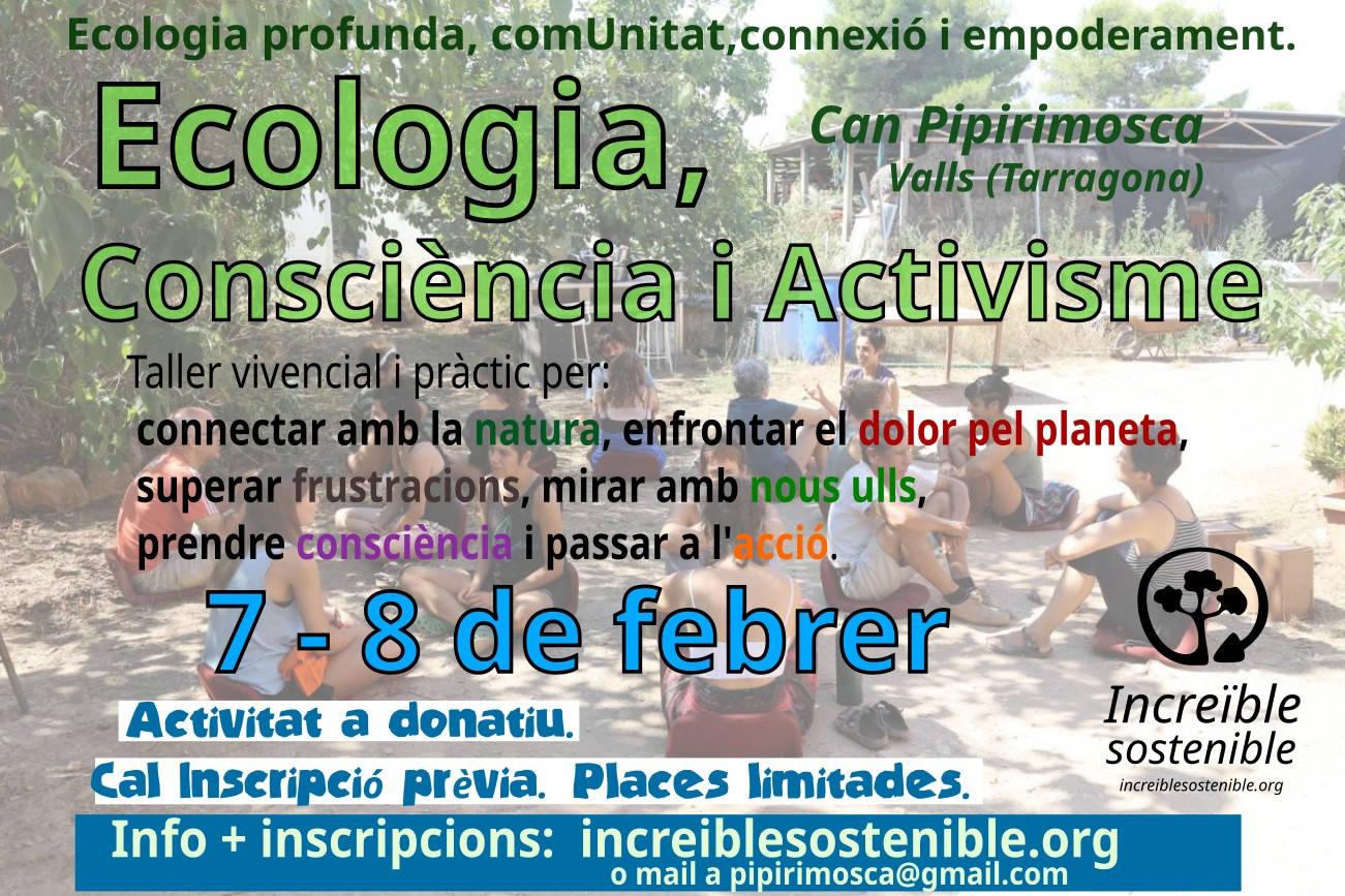 El 7 i 8 de febrer fem un cop més les jornades d'Ecologia, Consciència i Activisme, on coneixerem i vivenciarem els conceptes de l'ecologia profunda, tot fent un treball personal i grupal que ens ajudarà i recarregarà d'energies per seguir fent allò que cuida la vida i el planeta.